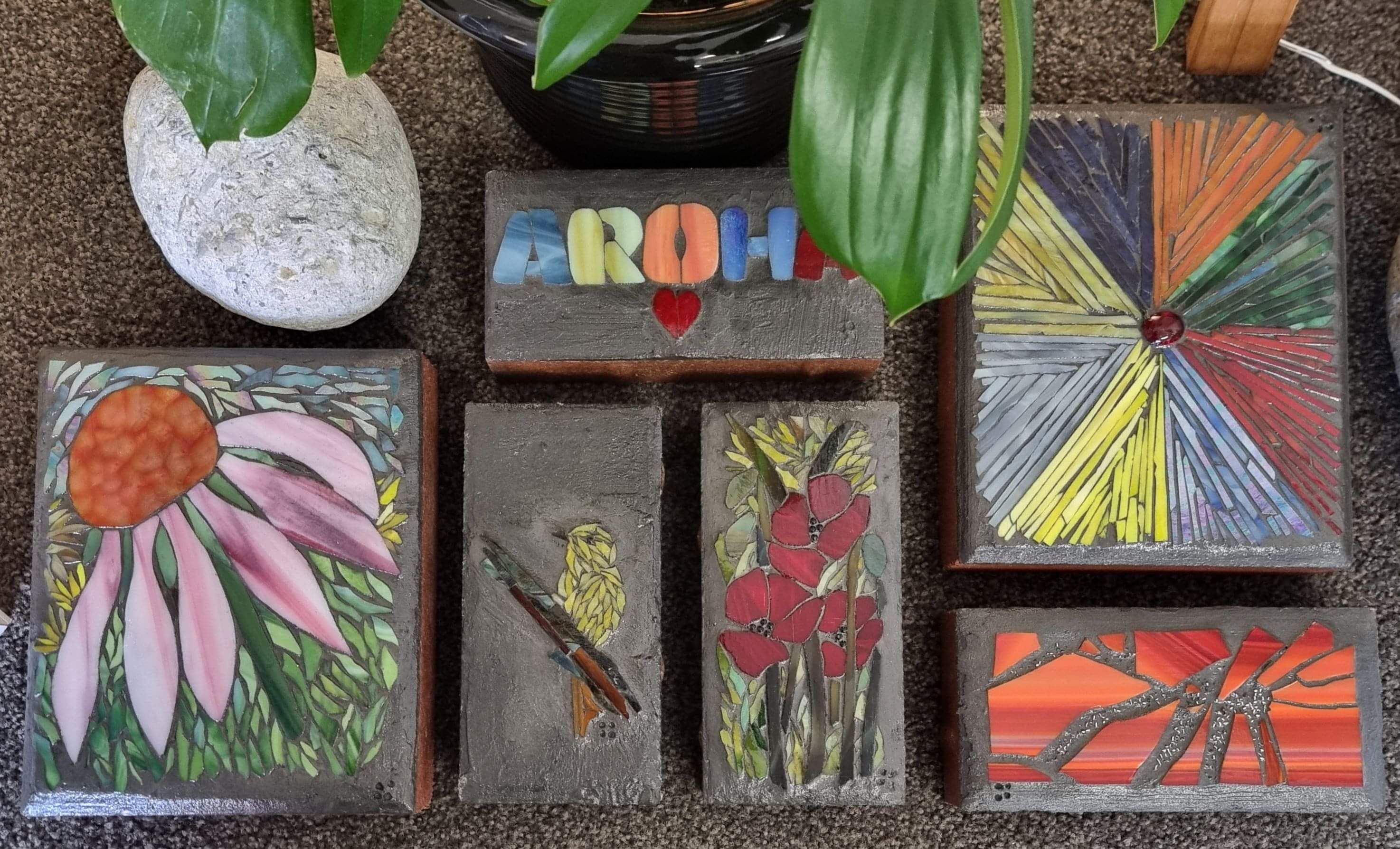 Beautiful new handmade stained glass mosaic pavers for your garden, pathway or use as a door stop