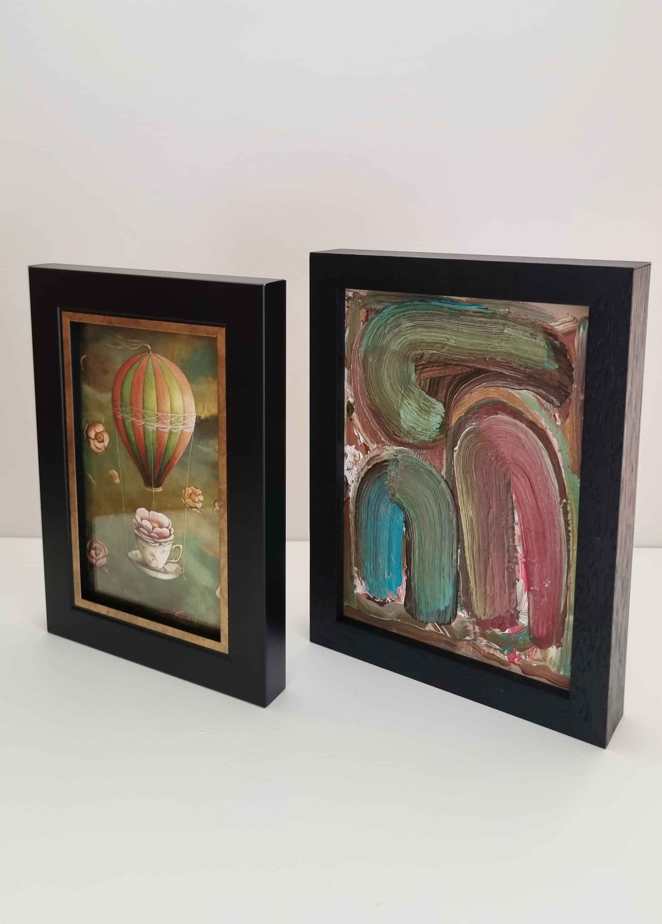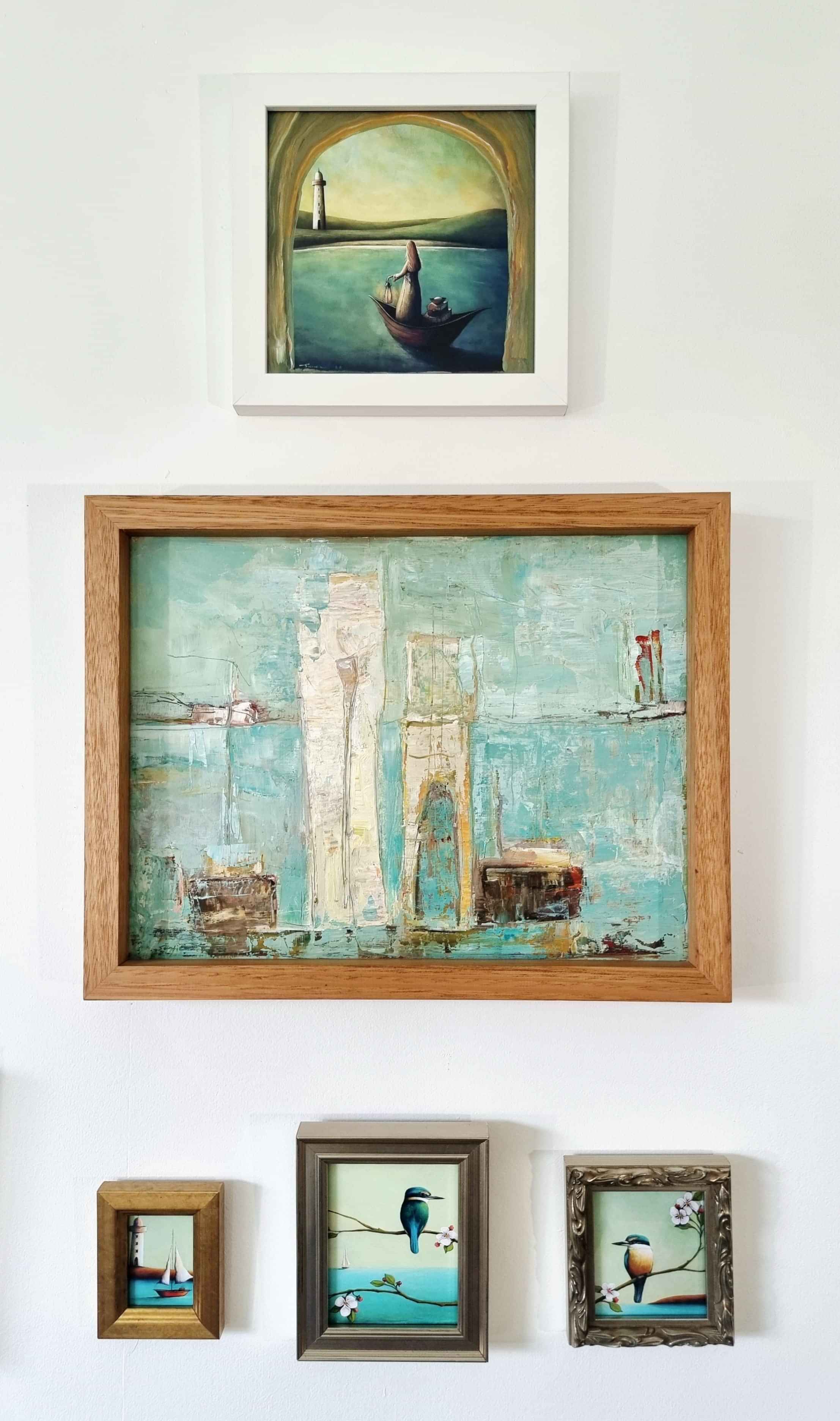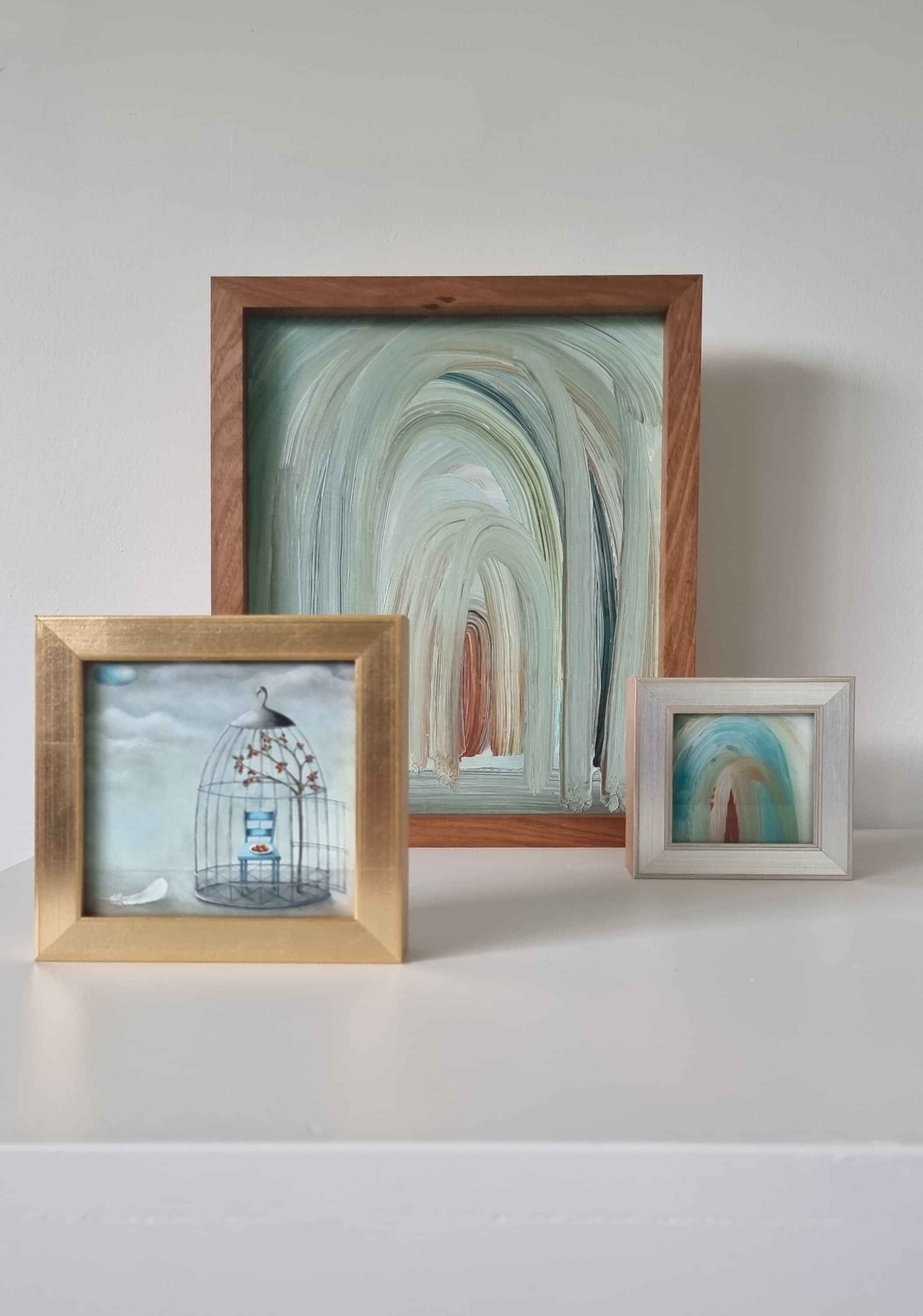 Original acrylics on custom wood, framed in solid timber, representing key Threshold works. These pieces carry the weight of experience, memory, and reflection, forming the anchor of the exhibition.