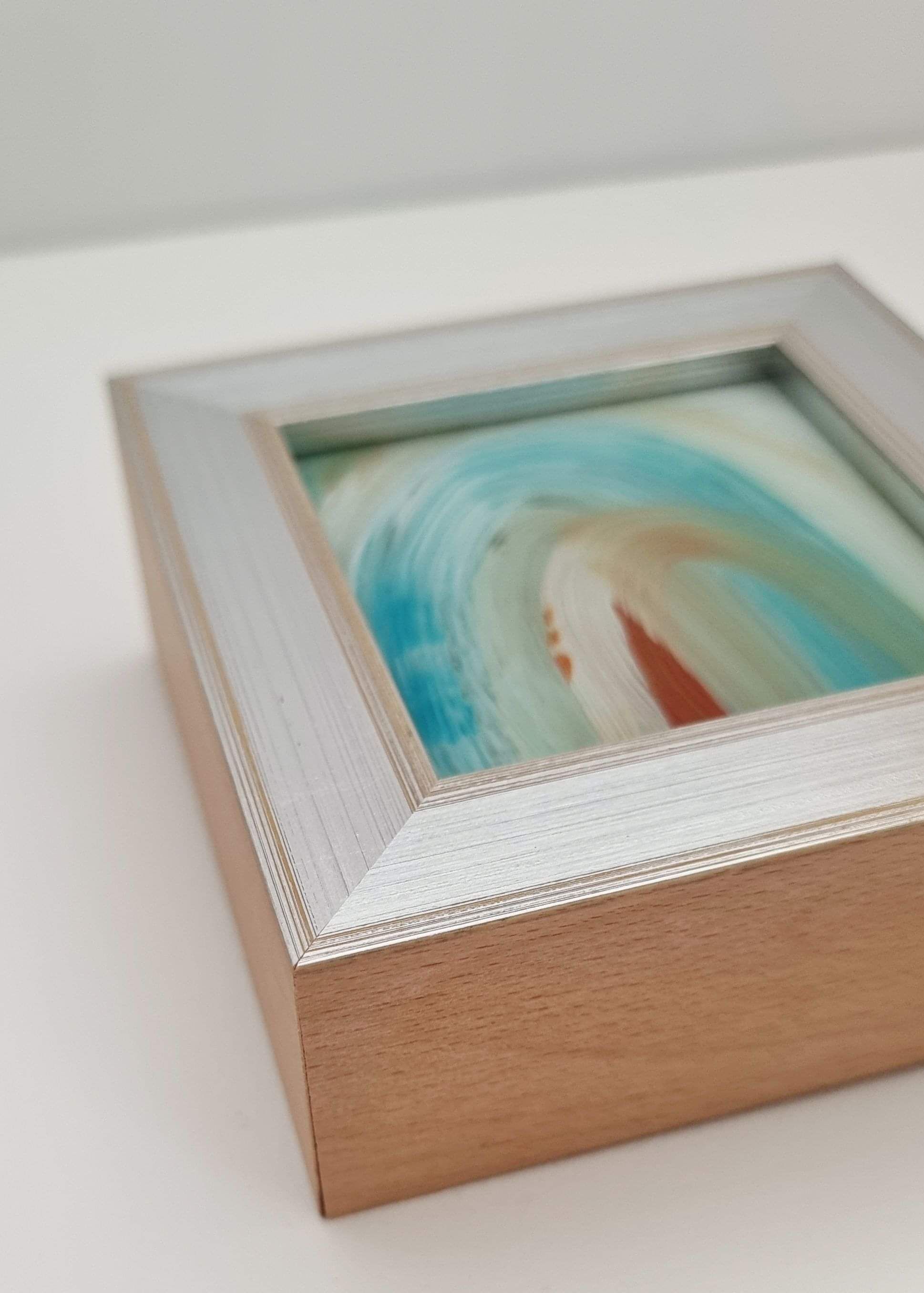 Small, vibrant paintings on reverse glass responding to early chapters and Threshold originals. Layers and colour interplay, create depth, dialogue, and intimacy in miniature form.