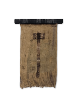 Moss dyed Belgian linen, rust and silk with handstitched silk detail, vintage French silk thread, charred Japanese cedar and Swedish linen thread.
