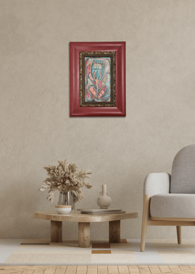 Mixed media on Paper in a deep pinky red ornate upcycled frame.