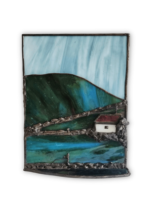 A striking stained glass landscape work with multi dimensional intricate layers. These are one-off original pieces with no two alike. 'Bothy' refers to a small hut or cottage, especially one for housing farm laborers or for use as a mountain refuge. A simple shelter in remote country for those who love being in wild & lonely places.