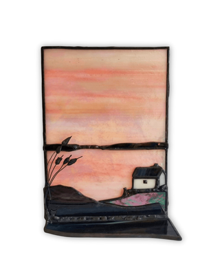 A striking stained glass landscape work with multi dimensional intricate layers and iridescent glass. These are one-off original pieces with no two alike.