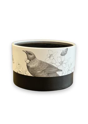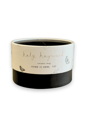 ‘Home is here’, featuring a tūī bird perched on a wave of Aotearoa | New Zealand native flora, including- puawananga | clematis, kawakawa, mānuka and kōwhai.