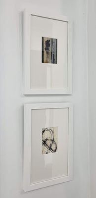 A monochromatic set of two small abstract works made purely from tea bags and ink.