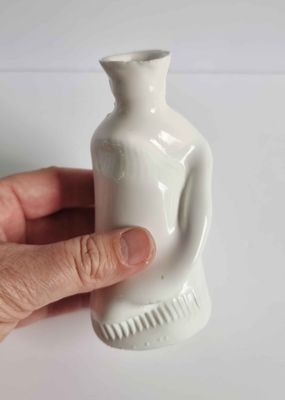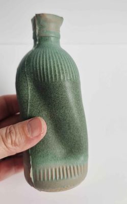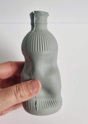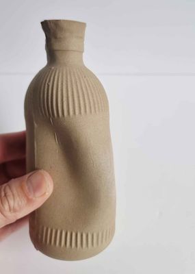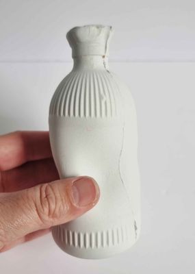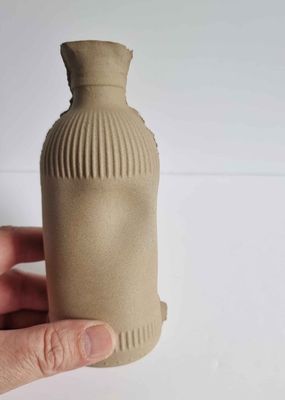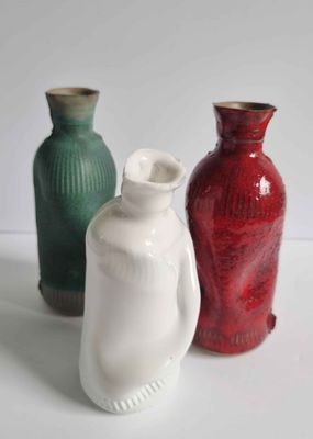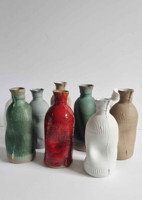 Crafted using slip casting, these ceramic bottles replicate discarded plastics to raise awareness about waste. Each bottle's shape is unique and can be used to display flowers or as decorative pieces.