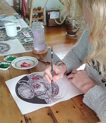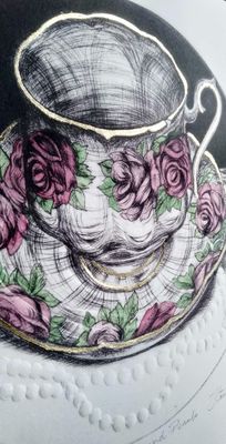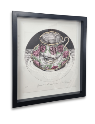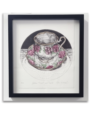 This print is a combination of four processes beginning with a drypoint etching of the tea set, then a linocut emboss of the pearls, before hand-colouring in the watercolour leaves and flowers and a final flourish of Gold Foil is added to complete the print. Subtle variations exist so each print is unique.