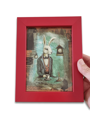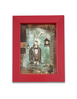 Framed Size: h209mm x w155mm x d25mm - framed in a deep red with non reflective glass.