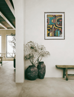 Framed in a distressed timber frame with museum Artglass AR70 - float framed.
