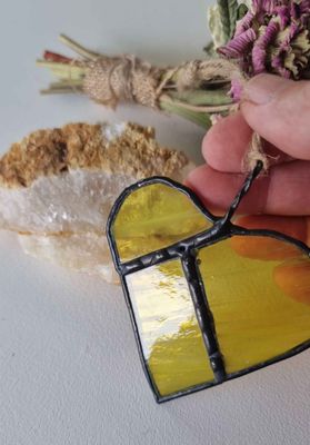 Hilary's pieces are made using the Tiffany Technique made famous by Louis Tiffany. The glass is hand cut, and the edges ground, to provide a purchase for the copper foil which surrounds the individual pieces. They are then soldered together using a 60/40 mix of tin/lead solder and finally either left in its silver tinned state or a black or copper patina is added. This technique allows for more detailed work and intuitive building up of layers that makes Hilary Jowle Glass very unique.