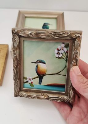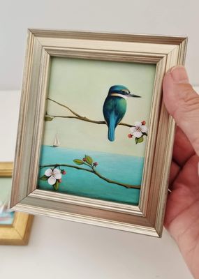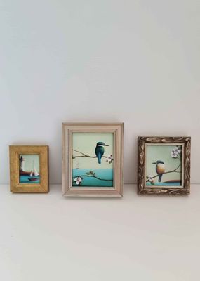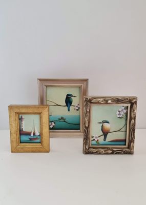 This intimate set of three early mini print proofs captures a deeply personal narrative — fragmented moments held in memory. Each frame contains a separate element: a Kingfisher observing, another Kingfisher looking on, and a sailboat with lighthouse, together forming a quiet story of journey, observation, and reflection. Framed individually, designed to be experienced as a connected set.