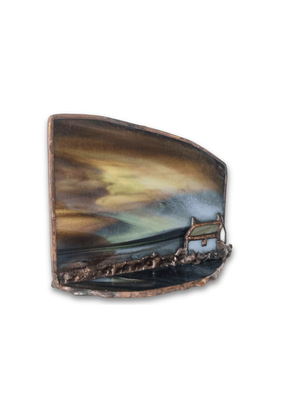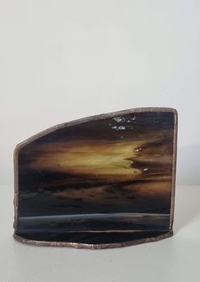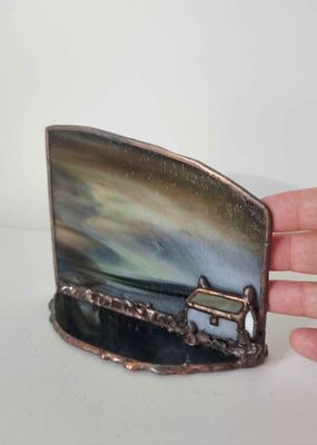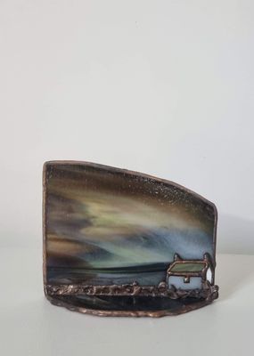 A small-scale rural dwelling rendered in stained artglass, reflecting simplicity and shelter. One-off original design. Each work begins with the glass, the image discovered rather than imposed, emerging through its patterns and movement. Certificate of authenticity provided.