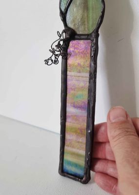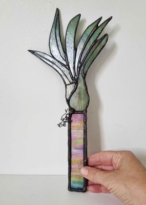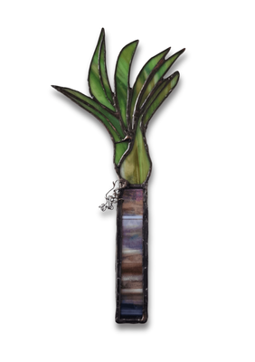 A free-formed sculptural wall artwork inspired by the Nikau palm. Constructed through layered glass with copper and lead detail, allowing the natural movement within the glass to inform the composition. One-off original design. Each work begins with the glass, the image discovered rather than imposed, emerging through its patterns and movement. Certificate of authenticity provided.